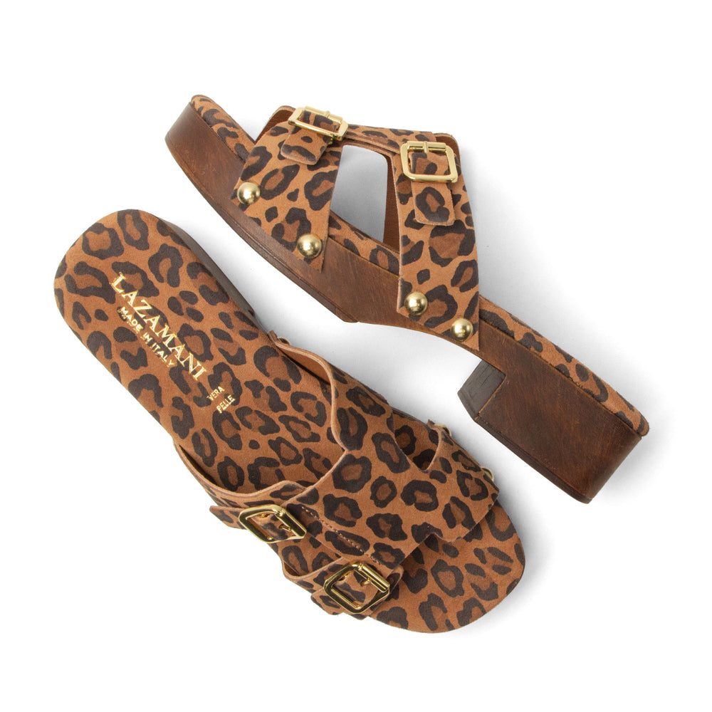 Deze clogs brengen een gedurfde dosis persoonlijkheid naar je zomergarderobe, met een mix van comfort en Italiaanse flair. De soepele suède bandjes met trendy luipaardprint voelen luxe aan, gecomplementeerd door de goudkleurige gespen en studs. De donkere houtlook blokhak van 3,5 centimeter biedt stabiliteit en loopt verrassend comfortabel dankzij het met suède beklede voetbed dat zacht meeverend aanvoelt. Combineer ze met een luchtige jurk, een linnen broek of een straight jeans voor een look die moeiteloos vrouwelijk, speels en eigenzinnig is – helemaal Lazamani.