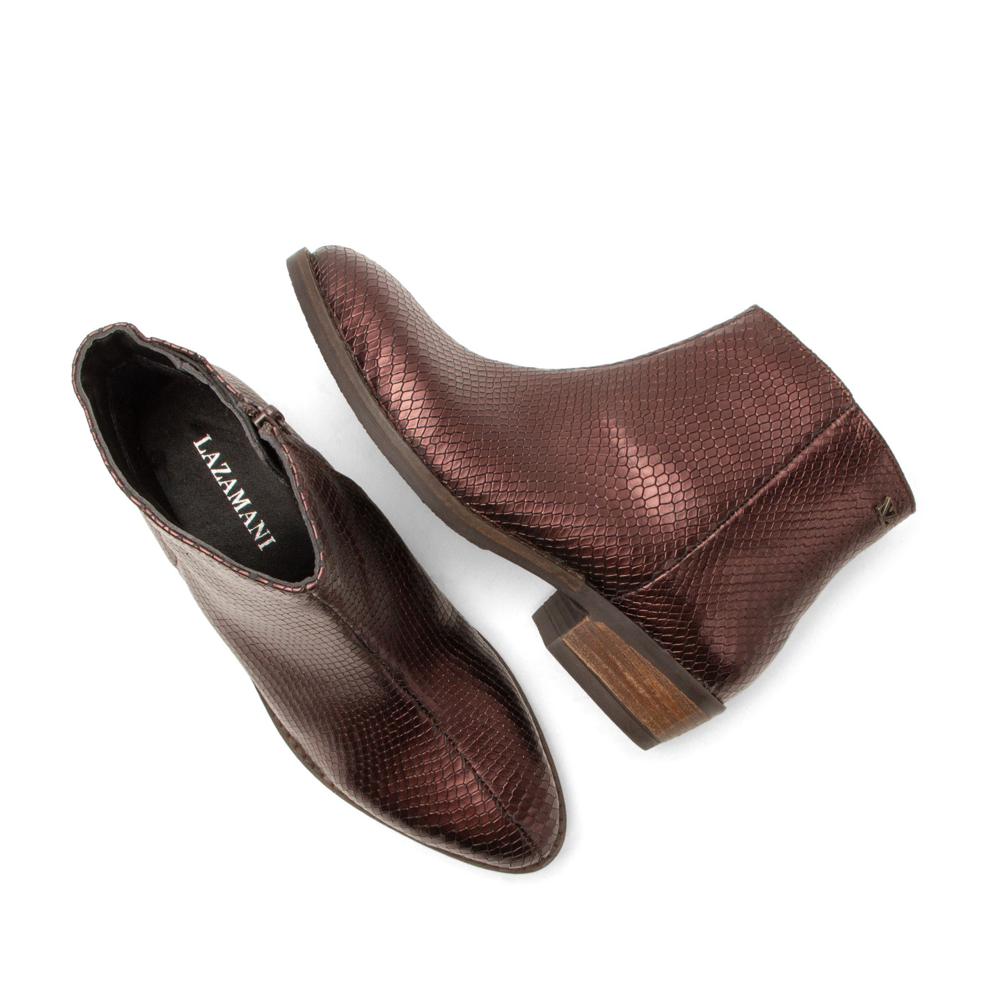 Laat je look spreken met deze glamoureuze enkellaarsjes van Lazamani. Het rijke merlotrode leer met slangenpatroon sluit perfect aan bij de modetrends van dit seizoen. De glanzende finish geeft een luxe en verfijnde uitstraling, terwijl het design je outfit een gedurfde, modieuze twist geeft. Dankzij de lage hak en comfortabele leest draag je ze moeiteloos de hele dag. De ritssluiting maakt aan- en uittrekken extra makkelijk. Combineer met een zwarte skinny jeans voor een avond uit of met een elegante jurk voor een onweerstaanbare statement look.