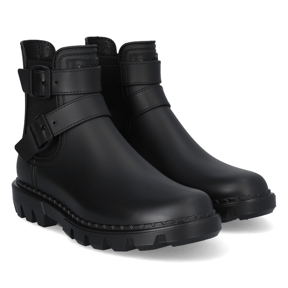 De laarsjes zijn uitgevoerd in chelsea-stijl met twee gespsluitingen als stoer detail. De elastische zijpanelen zorgen voor eenvoudig aan- en uitrekken. De rubberlaarsjes zijn waterdicht om je voeten