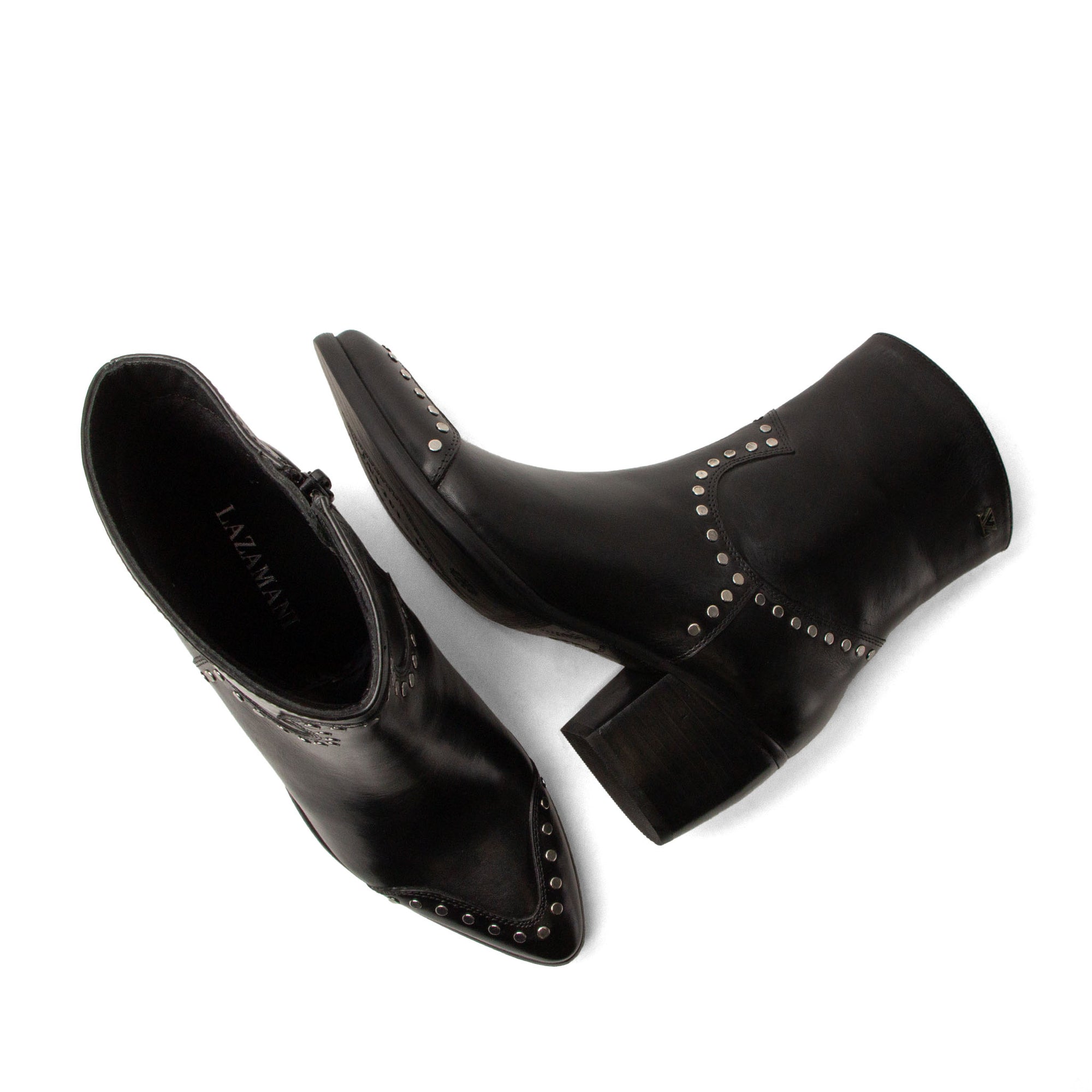 Ga voor elegant met een rock-chic randje met deze enkellaarzen van Lazamani. De laarsjes zijn gemaakt voor vrouwen die houden van stijl met karakter. Het gladde leer vormt een luxe basis, terwijl de zilverkleurige studs speels langs de belijning zijn geplaatst voor een subtiel stoer effect. De 6 centimeter hoge blokhak geeft je net dat beetje extra lengte zonder in te leveren op comfort. Dankzij de spitse neus ogen ze verfijnd en vrouwelijk. Combineer ze met een skinny jeans en leren jasje voor een stoere look, of draag ze onder een zwierige jurk voor een stijlvol contrast.